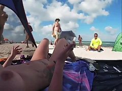 My facetiousmater touches my pussy exposed to a public beach among strangers plus voyeurs forth intense orgasm